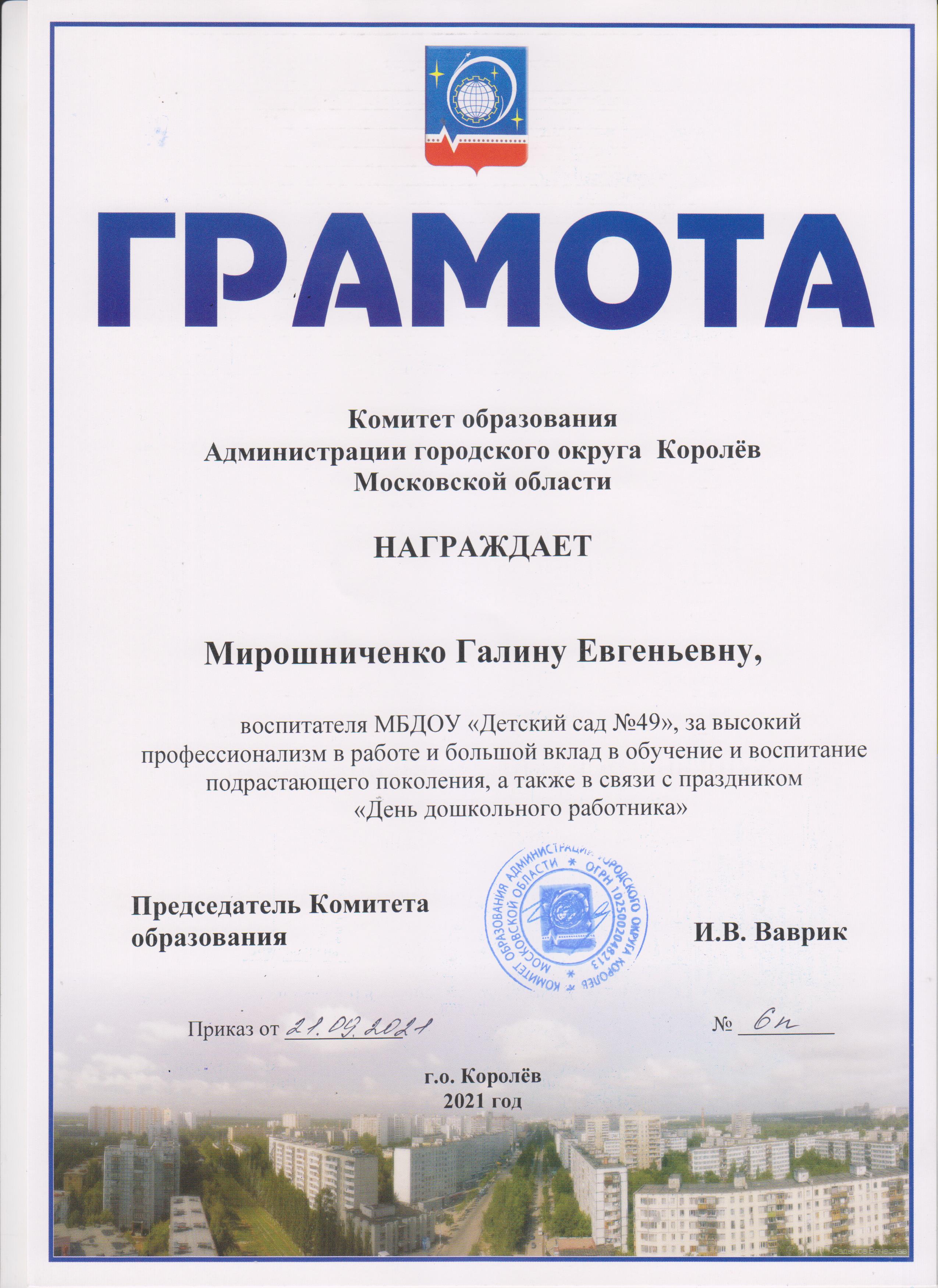 Почетная грамота главы г.о. Королёв Московской области, 2018 г.