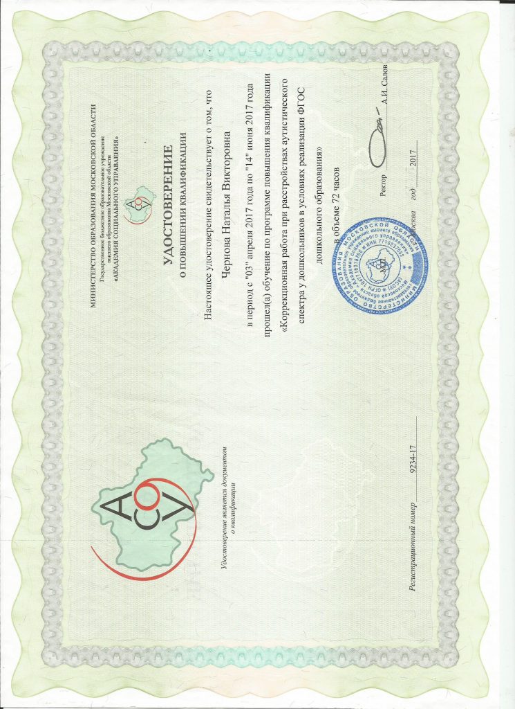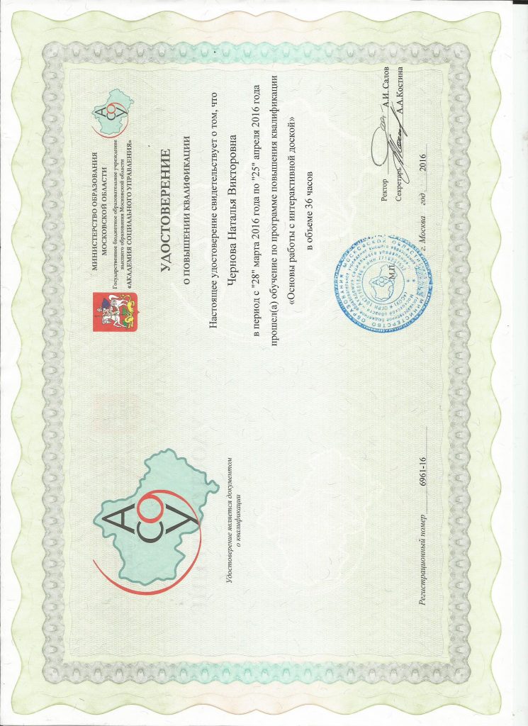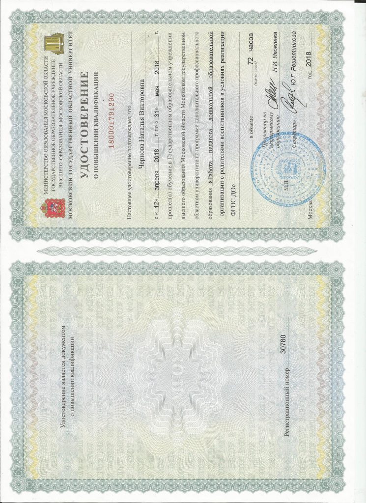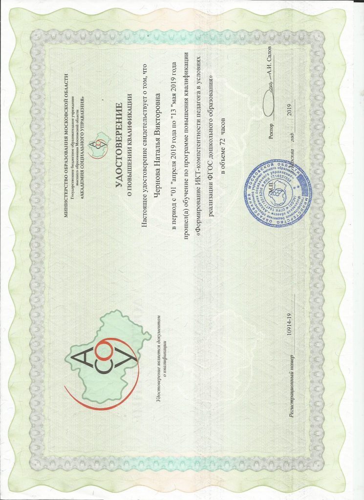 ГБОУ ВПО МО “Академия социального управления” «Формирование ИКТ-компетентности педагога в условиях реализации ФГОС ДО», 72 ч., 2019 год