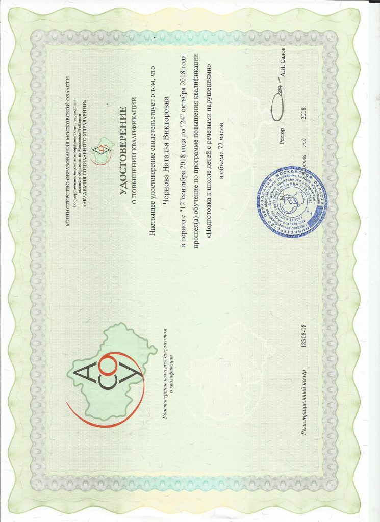 ГБОУ ВПО МО “Академия социального управления”. «Подготовка к школе детей с речевыми нарушениями», 72 ч.,2018 г