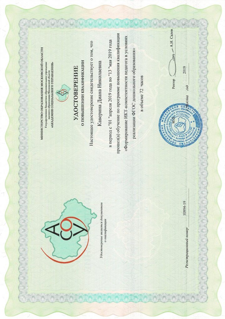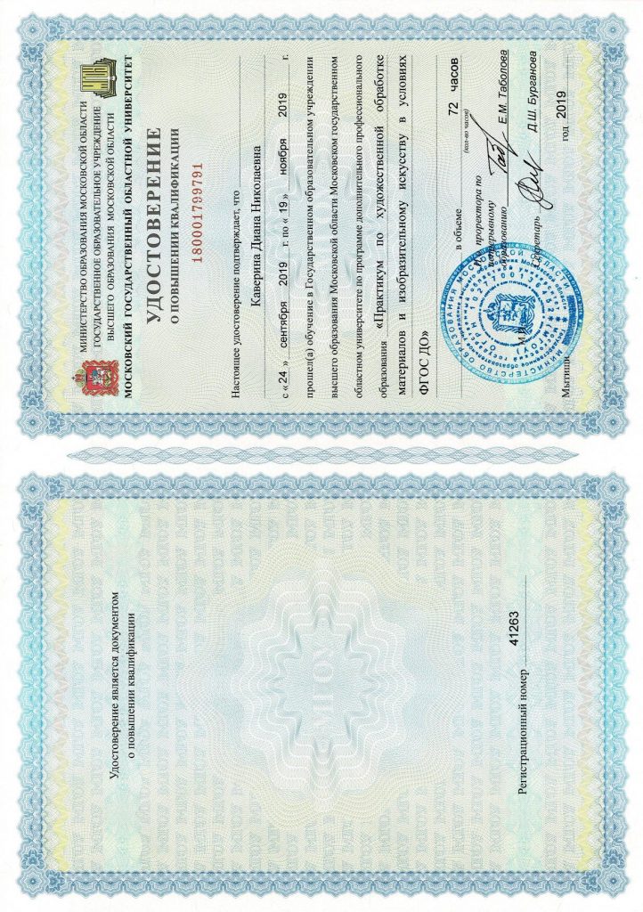 Московский областной государственный университет (МГОУ) «Практикум по художественной обработке материалов и изобразительному искусству в условиях ФГОС ДО», 72 ч., 2019 год