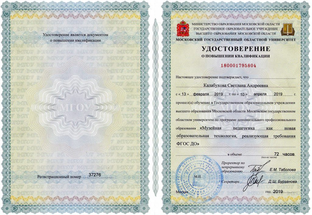 Московский областной государственный университет (МГОУ) «Музейная педагогика как новая образовательная технология, реализующая требования ФГОС ДО», 72 ч