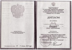 Уровень образования: Высшее. Санкт-Петербург. Государственное образовательное учреждение высшего профессионального образования “Российский государственный педагогический университет им. А.И.Герцена.” Квалификация: Педагог-психолог для работы с детьми дошкольного возраста.